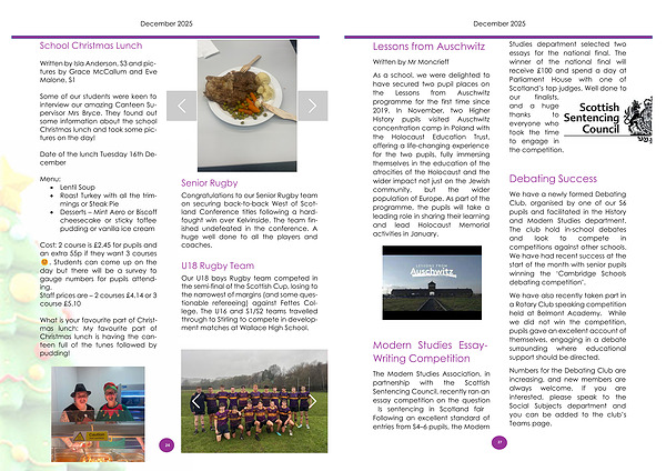 As a school, we were delighted to have secured two pupil places on the Lessons from Auschwitz programme for the first time since 2019. In November, two Higher History pupils visited Auschwitz concentration camp in Poland with the Holocaust Education Trust, offering a life-changing experience for the two pupils, fully immersing themselves in the education of the atrocities of the Holocaust and the wider impact not just on the Jewish community, but the wider population of Europe. As part of the programme, the pupils will take a leading role in sharing their learning and lead Holocaust Memorial activities in January.