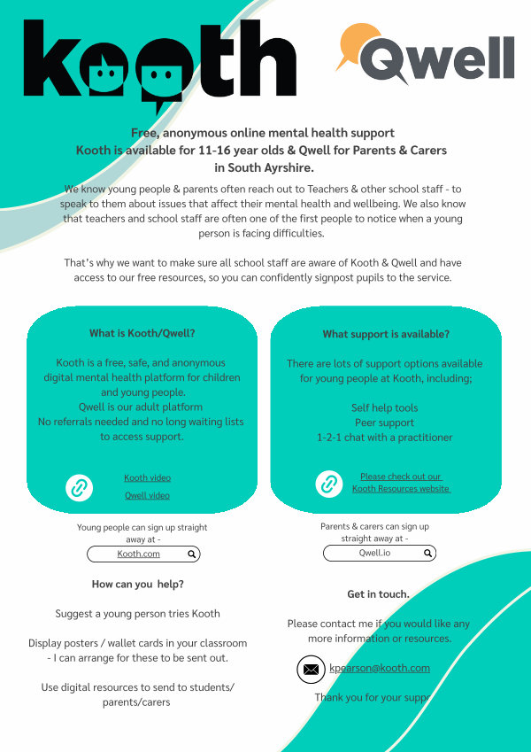 Free, anonymous online mental health support Kooth is available for 11-16 year olds & Qwell for Parents & Carers in South Ayrshire.