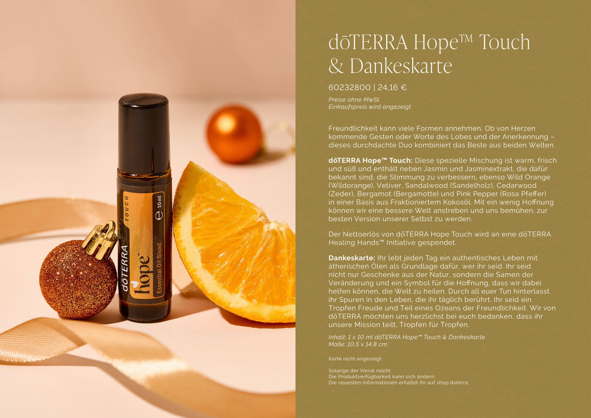 Inhalt: 1 x 10 ml dōTERRA Hope™ Touch & Dankeskarte Maße: 10,5 x 14,8 cm.