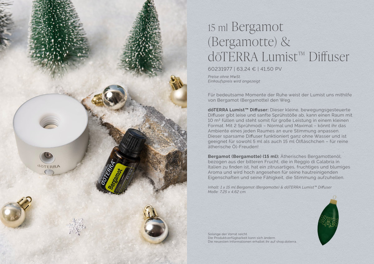 Inhalt: 1 x 15 ml Bergamot( Bergamotte) & dōTERRA Lumist™ Diffuser Maße: 7,25 x 4,62 cm.