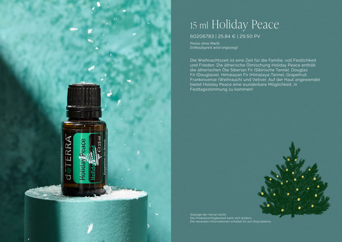 Die Weihnachtszeit ist eine Zeit für die Familie, voll Festlichkeit und Frieden. Die ätherische Ölmischung Holiday Peace enthält die ätherischen Öle Siberian Fir( Sibirische Tanne), Douglas Fir( Douglasie), Himalayan Fir( Himalaya-Tanne), Grapefruit, Frankincense( Weihrauch) und Vetiver. Auf der Haut angewendet bietet Holiday Peace eine wunderbare Möglichkeit, in Festtagsstimmung zu kommen!