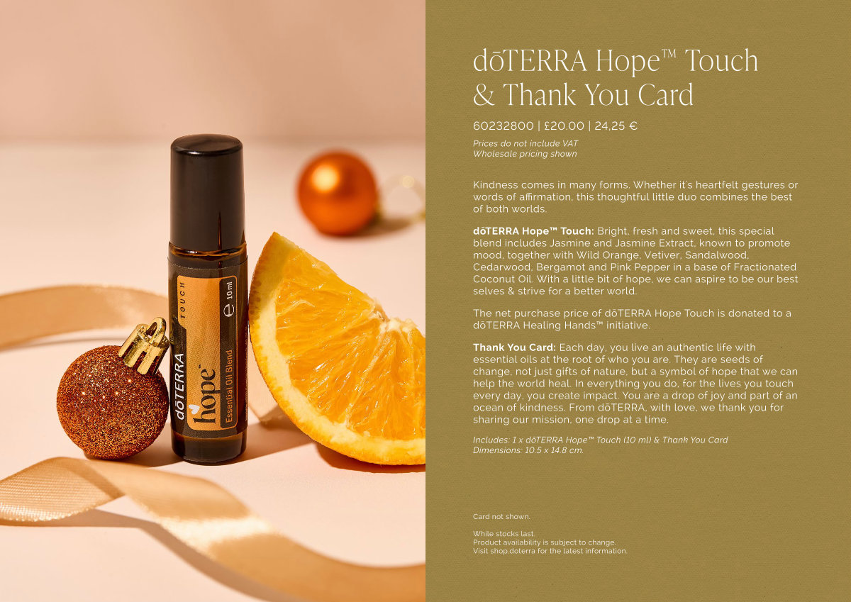 Includes: 1 x dōTERRA Hope™ Touch( 10 ml) & Thank You Card Dimensions: 10.5 x 14.8 cm.