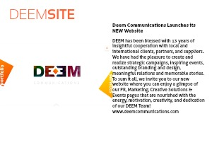 DEEM has been blessed with 13 years of insightful cooperation with local and international clients, partners, and suppliers. We have had the pleasure to create and realize strategic campaigns, inspiring events, outstanding branding and design, meaningful relations and memorable stories. To sum it all, we invite you to our new website where you can enjoy a glimpse of our PR, Marketing, Creative Solutions & Events pages that are nourished with the energy, motivation, creativity, and dedication of our DEEM Team!