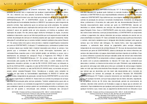 referente ao( s) pagamento( s) do presente instrumento. Aqui fica estabelecido que o prestador de serviço será o responsável por qualquer responsabilidade trabalhista( férias, 13 º, etc.) referente aos seus próprios funcionários. Também fica estabelecido que a contratada precisará fornecer uma nota fiscal pela prestação de serviços. Os Serviços DOS SERVIÇOSCláusula 10 ª: A CONTRATADA atuará no projeto de acordo com as especificações de funcionalidades descritas no ANEXO 01 que passa ser parte integrante do presente contrato. Aqui explicamos quais os serviços que serão prestados. No exemplo acima, estamos dizendo que a explicação dos serviços está no Anexo 01, que compõe este contrato. O anexo em questão pode ser uma proposta, um briefing ou qualquer outra explicação do projeto. Ele não precisa seguir nenhuma formatação ou regras, só precisa estabelecer claramente o que vai ser feito. Isso permite que você reaproveite este modelo de contrato de prestação de serviços em diversos projetos sem que sejam necessárias muitas alterações. É aconselhável que os anexos também recebam assinatura das partes. Cláusula 11 ª: Os serviços terão início após o envio de todo o material e especificações necessários por parte da CONTRATANTE. A cláusula 11 º estabelece que a contratada só poderá iniciar os serviços depois que receber todo o material necessário para efetuar os serviços. Isso garante que a contratante não deixe de enviar informações importantes para a contratada. Esses requisitos para o início também podem ser definidos no anexo com o detalhamento da prestação de serviços. O Preço e Pagamento DO PREÇO E DAS CONDIÇÕES DE PAGAMENTOCláusula 12 ª: Os serviços alvos deste contrato serão remunerados pela quantia de R $ XX. XXX, XX( XXX reais), a serem divididos em três pagamentos, devendo o primeiro, no valor de R $ X. XXX, XX( XXXX reais), ser efetuado no dia XX de XXXX de XXXX, o segundo, no valor de R $ X. XXX, XX( XXXX reais), no dia XX de XXXX de XXXX e o terceiro, no valor de R $ XXX, XX( XXXXX reais), no momento em que o projeto estiver completo. Parágrafo Único: Considera-se o projeto como completo no momento em que todas as funcionalidades especificadas no ANEXO 01 tenham sido desenvolvidas, independente da aprovação, revisão final da CONTRATANTE ou outra forma de entrega especificada no ANEXO 01. Neste trecho do contrato de prestação de serviços definimos a remuneração pelos serviços prestados. Também estabelecemos quais são as parcelas, seus valores e as condições de pagamento. O parágrafo único é opcional e serve para estabelecer quando os serviços podem ser considerados concluídos ou entregues. Isso pode ser útil quando a remuneração está atrelada à finalização dos serviços. O