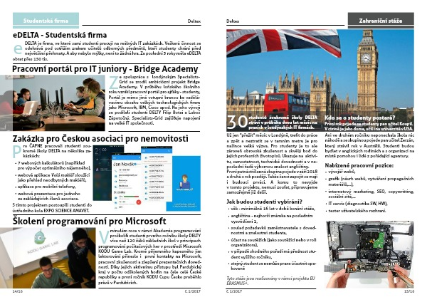DELTA je firma, ve které sami studenti pracují na reálných IT zakázkách. Veškerá činnost se odehrává pod ostřížím zrakem učitelů odborných předmětů, kteří studenty chrání před největšími přehmaty. A aby nebylo mýlky, není to žádná hra. Za poslední 3 roky měla eDELTA