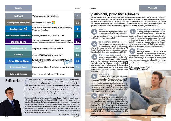 Nezapomněli jsme ani na uchazeče o studium. Přinášíme popis oboru Informační technologie, který se na DELTĚ učí už od roku 2007 ve dvou zaměřeních: Správce informačních systémů a Internetový marketing. Dočtete se také, že letos budeme opět otevírat dvě třídy, o jaký typ studentů máme zájem, podmínky přijímacího řízení a další informace, které vám mohou pomoci ve volbě vašeho povolání. Zveme vás také na naše dny otevřených dveří, ať si na vlastní kůži vyzkoušíte, co znamená studium na soukromé školy DELTA.