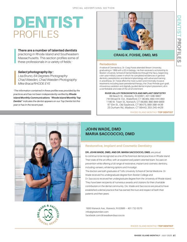 There are a number of talented dentists practicing in Rhode Island and Southeastern Massachusetts. This section profiles some of these professionals in a variety of fields. *