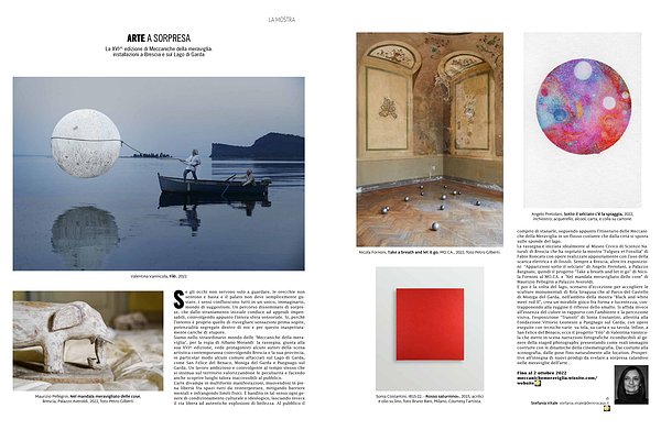 Se gli occhi non servono solo a guardare , le orecchie non sentono e basta e il palato non deve semplicemente gustare , i sensi confluiscono tutti in un unico , immaginario , mondo di suggestioni . Un percorso disseminato di sorprese , che dallo straniamento iniziale conduce ad approdi impensabili , coinvolgendo appunto l ’ intera sfera sensoriale . Sì , perché l ’ intento è proprio quello di risvegliare sensazioni prima sopite , potenzialità segregate dentro di noi e per questo inaspettatamente cariche di stupore . Siamo nello straordinario mondo delle “ Meccaniche della meraviglia ”, per la regia di Albano Morandi : la rassegna , giunta alla sua XVI^ edizione , vede protagonisti alcuni autori della scena artistica contemporanea coinvolgendo Brescia e la sua provincia , in particolar modo alcuni comuni affacciati sul Lago di Garda , come San Felice del Benaco , Moniga del Garda e Puegnago sul Garda . Un lavoro ambizioso e coinvolgente al tempo stesso che si insinua sul territorio valorizzandone le peculiarità e facendo anche scoprire luoghi talora inaccessibili al pubblico . L ’ arte divampa in multiformi manifestazioni , muovendosi in piena libertà fra spazi tutti da reinterpretare , mitigando barriere mentali e infrangendo limiti fisici . È bandito in tal senso ogni genere di condizionamento culturale o ideologico , lasciando invece il via libera ad autentiche esplosioni di bellezza . Al pubblico il