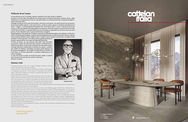 La casa diventa un set. Tra design, materia e quella luce che solo l’ estate sa regalare. E questo è il nostro film. Una pellicola che insegue trame naturali di atmosfere, profumi, sapori... Ogni fotogramma è un’ inquadratura d’ autore e gli spazi sfilano su un’ ideale passerella, svelandosi prodigiosamente uno dopo l’ altro. I dettagli raccontano storie tutte da ricordare: emozioni a cielo aperto, ma anche interni che incarnano a pieno il mood della stagione. Come ogni numero, anche per questo agosto è il desiderio ad indirizzare il nostro“ viaggio”. I veri protagonisti rimaniamo noi, con il nostro stile e i nostri“ costumi di scena” che vanno a vestire gli ambienti lasciando parlare le sensazioni. Sì perché, proprio come davanti ad un film, è facile lasciarsi andare, trasportati dalla forza di un’ immagine e spaziando con la mente senza una meta precisa. È così, dopotutto, che i sogni si trasformano in progetti. Progetti appunto, come quelli che vi andiamo a presentare nelle prossime pagine e che celebrano i colori, la vitalità e il mood di questa stagione. Progetti votati principalmente alla creazione di atmosfere intense e vibranti ma al contempo declinate al più completo relax. E, proprio mentre il tempo si fa più lento e la voglia di relax scandisce le nostre giornate, ecco alcune piccole, grandi, promesse di energia e spensieratezza, ma sempre nel segno dell’ esclusività. Si parte di slancio con una lussuosa villa della Costa Smeralda, un autentico sogno ad occhi aperti dal carattere contemporaneo e dall’ anima scultorea. E poi ancora, abitazioni che incarnano a pieno l’ energia dell’ estate sottolineando la sintonia fra indoor e outdoor: qui comfort ed eleganza consolidano la propria sottile alleanza con il contesto paesaggistico. Un viaggio tra Palm Beach, la Sicilia e il Costa Rica, tra il lusso americano, il carattere mediterraneo e la natura selvaggia. E, visto che l’ estate è anche un trionfo di sapori, andate a scoprire chi ci ha aperto le porte del suo esclusivo ristorante. Mettetevi comodi...