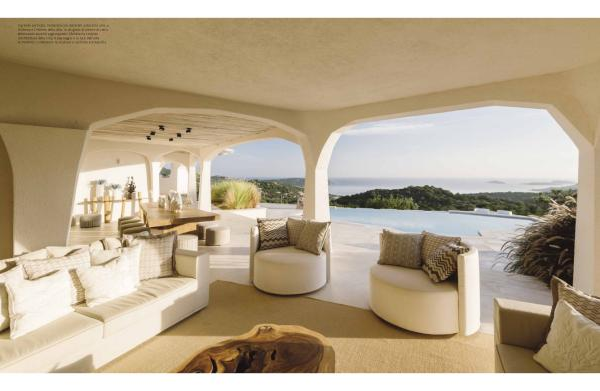 Il grande porticato, realizzato con materiali autoctoni, unisce l’ esterno e l’ interno della villa: in un gioco di pieni e di vuoti, eliminando anziché aggiungendo, l’ Artista ha scolpito l’ architettura della villa. Il paesaggio e la luce dall’ alba al tramonto completano la studiata e calibrata scenografia.