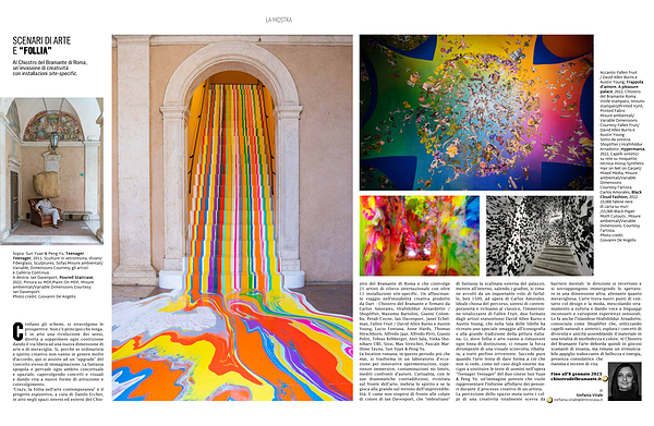 Accanto : Fallen Fruit / David Allen Burns e Austin Young , Trappola d ’ amore . A pleasure palace , 2022 , Chiostro del Bramante Roma Vinile stampato , tessuto stampato / Printed Vynil , Printed Fabric Misure ambientali / Variable Dimensions Courtesy Fallen Fruit / David Allen Burns e Austin Young Sotto da sinistra : Shoplifter / Hrafnhildur Arnadottir , Hypermania , 2022 , Capelli sintetici su rete su moquette , tecnica mista / Synthetic Hair on Net on Carpet / Mixed Media , Misure ambientali / Variable Dimensions Courtesy l ' artista . Carlos Amorales , Black Cloud Fashion , 2022 15,000 falene nere di carta su muri / 15,000 Black Paper Moth Cutouts , Misure ambientali / Variable Dimensions . Courtesy l ' artista . Photo credit : Giovanni De Angelis stro del Bramante di Roma e che coinvolge 21 artisti di rilievo internazionale con oltre 11 installazioni site-specific . Un affascinante viaggio nell ’ instabilità creativa prodotto da Dart - Chiostro del Bramante e firmato da Carlos Amorales , Hrafnhildur Arnardóttir / Shoplifter , Massimo Bartolini , Gianni Colombo , Petah Coyne , Ian Davenport , Janet Echelman , Fallen Fruit / David Allen Burns e Austin Young , Lucio Fontana , Anne Hardy , Thomas Hirschhorn , Alfredo Jaar , Alfredo Pirri , Gianni Politi , Tobias Rehberger , Anri Sala , Yinka Shonibare CBE , Sissi , Max Streicher , Pascale Marthine Tayou , Sun Yuan & Peng Yu . La location romana , in questo periodo più che mai , si trasforma in un laboratorio d ’ eccezione per innovative sperimentazioni , esperienze immersive , contaminazioni no limits , inediti confronti d ’ autore . L ’ attualità , con le sue drammatiche contraddizioni , rivisitata sul fronte dell ’ arte , inebria lo spirito e se la gioca alla grande sul terreno dell ’ imprevedibilità . E come non stupirsi di fronte alle colate di colore di Ian Davenport , che “ imbrattano ” di fantasia la scalinata esterna del palazzo , mentre all ’ interno , salendo i gradini , si rimane avvolti da un inquietante volo di farfalle , ben 1500 , ad opera di Carlos Amorales . Ideale chiosa del percorso , sintesi di contemporaneità e richiamo al classico , l ’ immersione totalizzante di Fallen Fruit , duo formato dagli artisti statunitensi David Allen Burns e Austin Young , che nella Sala delle Sibille ha ricreato uno speciale omaggio all ’ iconografia e alla grande tradizione della pittura italiana . Lì , dove follia e arte vanno a rimuovere ogni linea di distinzione , ci rimane la forza dirompente di una visuale sconvolta , ribaltata , a tratti perfino irriverente . Succede pure quando l ’ arte tenta di dare forma a ciò che non si vede , come nel caso degli enormi macigni a sostituire le teste di uomini nell ’ opera “ Teenager Teenager ” del duo cinese Sun Yuan & Peng Yu : un ’ immagine potente che vuole rappresentare l ’ informe affollarsi dei pensieri durante il processo creativo di un artista . La percezione dello spazio muta sotto i colpi di una creatività totalmente scevra da barriere mentali : le direzioni si invertono e si sovrappongono immergendo lo spettatore in una dimensione altra , alienante quanto meravigliosa . L ’ arte trova nuovi punti di contatto col design e la moda , mescolando straniamento a euforia e dando voce a linguaggi inconsueti e variopinte esperienze sensorali . Lo fa anche l ’ islandese Hrafnhildur Arnadottir , conosciuta come Shoplifter che , utilizzando capelli naturali e sintetici , esplora i concetti di diversità e unicità assemblando il materiale in una totalità di morbidezza e colore . Al Chiostro del Bramante l ’ arte deborda quindi in giocosi scampoli di insania , ma rimane un irrinunciabile appiglio traboccante di bellezza e energia , presenza consolatrice che rianima e investe di vita .