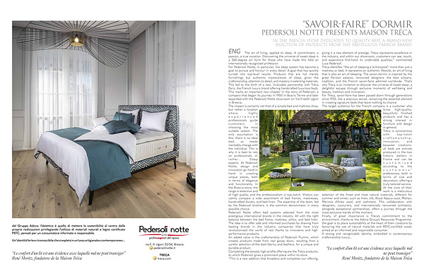 The art of living, applied to sleep. A commitment, a passion, a true vocation. Discovering the universe of sweet sleep is a 360-degree art form for those who have made this field an internationally recognized profession. For Pedersoli Notte, in particular, the sleep system has become a goal to pursue and honour in every detail. A goal that has quickly turned into top-level results. Products that are not merely furnishings but authentic masterpieces of sleep, given the craftsmanship, attention to detail, and mastery in selecting materials. This led to the birth of a new, invaluable partnership with Tréca Paris, the French luxury brand offering handcrafted luxurious beds. This marks an important new chapter in the story of Pedersoli, a company that began its journey in 1950 in Boario Terme and later expanded with the Pedersoli Notte showroom on Via Fratelli Ugoni in Brescia. The impact is certainly not that of a simple bed and mattress shop, but rather a location where highly experienced professionals guide customers in choosing the most suitable system. The only assumption is this: there is no ideal bed, as needs inevitably change with the individual. This is why it is best to rely on professionals, or rather … Sleep experts. At Pedersoli Notte, design and innovation go hand in hand in creating unique pieces, both in terms of elegance and functionality. In the Brescia store, the range is extensive and of high quality, and the professionalism is top-notch. Visitors can calmly compare a wide assortment of bed frames, mattresses, handcrafted duvets, and bed linen. The expertise of the team, led by the Pedersoli brothers, is the common denominator in every possible choice. Pedersoli Notte offers bed systems selected from the most prestigious international brands in the industry. All with the right balance between the bed frame, mattress, pillow, and bed linen. The idea is to offer safe and informed purchases by drawing from leading brands in the industry, companies that have truly revolutionized the world of rest thanks to innovative and highperformance products. An added value is the craftsmanship of Pedersoli Piumini, which creates products made from real goose down, resulting from a careful selection of the best fabrics and feathers, for a unique and durable product. Completing the already high-profile offering are the Tréca products, to which Pedersoli gives a prominent place within its store.“ This is a new addition that broadens and completes our offering, giving it a new element of prestige. Tréca represents excellence in the industry, and within our showroom, customers can see, touch, and experience first-hand its undeniable qualities,” commented Luca Pedersoli. Tréca identifies“ the art of sleeping à la française”: more than just a mattress or bed, it represents an authentic lifestyle, an art of living that is also an art of sleeping. The savoir-dormir is inspired by the great Parisian palaces, renowned designers, the best artisans, tradition, and the French savoir-faire admired worldwide. That’ s why Tréca is an invitation to discover the universe of sweet sleep: a delightful escape through exclusive moments of well-being and beauty, tradition and innovation. For Tréca, savoir-faire has been passed down through generations since 1935, like a precious secret, remaining the essential element in creating signature beds that leave nothing to chance. The target audience for the French company is a customer who loves high-quality, beautifully finished products and has a strong interest in furniture and design in general. Tréca is synonymous with top-notch craftsmanship, innovation, and bespoke creations: all beds are entirely produced in the two historic ateliers in France and can be c u s t o m i z e d according to the c u s t o m e r s’ preferences, both in terms of size and decoration, offering a truly tailored service. At the core of their work is a meticulous selection of the finest and most natural materials, different for summer and winter, such as linen, silk, Royal Alpaca wool, Mohair, Merinos d’ Arles wool, and cashmere. This collaboration with designers, couturiers, and internationally renowned architects, alongside exceptional partnerships, offers a journey through the most exclusive trends of the moment. Finally, of great importance is Tréca’ s commitment to the environment, thanks to the Adova Group’ s Resources Programme: the goal is to place sustainability at the heart of their creations by favouring the use of natural materials and PEFC-certified wood, aimed at an informed and responsible consumer. A strong and recognizable identity, embodied in contemporary craftsmanship luxury …