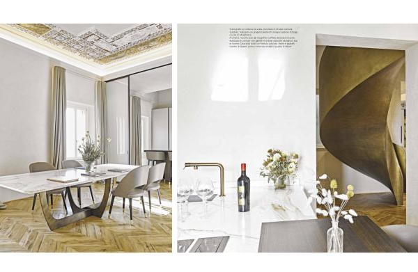 Scenografica e sinuosa la scala elicoidale in ottone naturale ossidato, realizzata su progetto dell’ arch. Filippo Gastone Scheggi. Cucina di Modulnova. A sinistra: incorniciato dal magnifico soffitto decorato il tavolo realizzato su misura con gambe in ottone naturale ossidato e top in marmo Calacatta Gold con finitura satinata. Sedie e sgabelli Colette di Baxter; porta scorrevole modello Quadra di Albed.