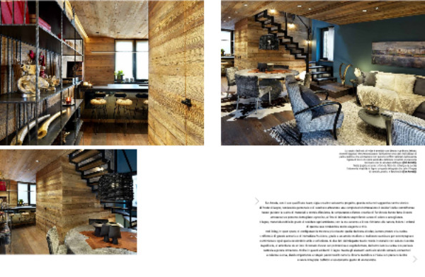 Lo spazio dedicato al relax è arredato con divano e poltrona lettura . Accenti singolari che personalizzano l ’ abitazione sono dati dall ’ utilizzo di pelli e pellicce che contrastano con pareti e soffitti vellutati dall ’ essenza lignea . Il tocco di colore verde – blu definisce il salotto in piacevole contrasto con le venature del legno ( Far Arreda ).