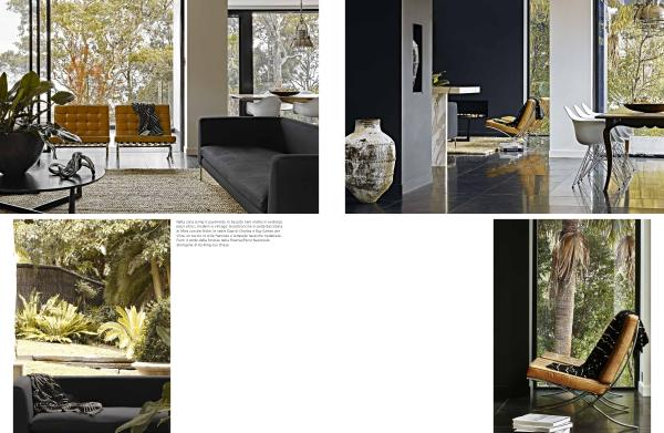 Nella zona living il pavimento in basalto nero mette in evidenza pezzi etnici , moderni e vintage : le poltroncine in pelle Barcelona di Mies van der Rohe , le sedie Daw di Charles e Ray Eames per Vitra , un tavolo in stile francese e lampade nautiche riadattate . Fuori il verde della foresta nella Riserva / Parco Nazionale aborigena di Ku-Ring-Gai Chase .