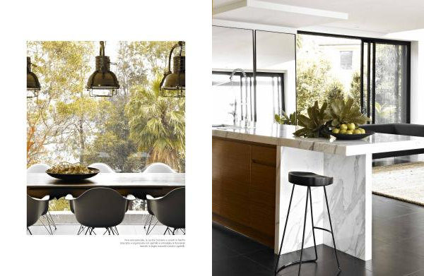 Pura ed essenziale , la cucina col piano e i piedi in marmo Calacatta è organizzata con sportelli e armadiature funzionali rivestiti in legno naturale e pratici sgabelli .