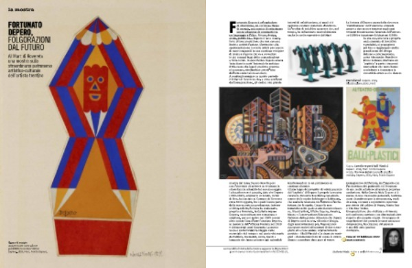 Sopra : Cartellone per I Balli Plastici , Depero , 1918 , Mart , Fondo Depero . A lato : The New Babel ( Scenario plastico mobile ), Depero , 1930 , Mart , Fondo Depero . mostra dal tema Depero New Depero con l ’ obiettivo di mettere in evidenza la straordinaria attualità del suo messaggio . La location non è casuale , dato che Depero ( 1892-1960 ), originario di Fondo , in Val di Non , ha lasciato al Comune di Rovereto circa 3000 oggetti , fra i quali buona parte della sua eccentrica produzione . Intorno al 1957 , infatti , l ’ artista ha realizzato , proprio a Rovereto , la Galleria museo Depero , successivamente restaurata e ampliata , per poi aprire nel 2009 con un altro nome : Casa d ’ Arte Futurista Depero , in memoria dell ’ officina fondata nel 1919 e chiusa negli anni Quaranta . La nuova veste è un formidabile viaggio nelle meraviglie del tempo e nel genio visionario dell ’ artista , tra mobili , sedie , tavoli e lampade che fanno pensare agli splendidi trasformandosi in un patrimonio in continuo divenire . Ultima tappa del progetto di valorizzazione del “ capitale ” di Depero è proprio la mostra curata da Nicoletta Boschiero , con allestimento dello studio Baldessari e Baldessari , che esalta la relazione tra l ’ artista e l ’ architettura che lo ospita . Cinque le aree tematiche nelle quali si articola : Introduzione , Ricostruzioni , Effetto Depero , America , Museo e Conservazione / Educazione . Partendo dalla grande influenza che l ’ opera di Depero avrà su arte , editoria e design , dagli anni Settanta in poi , l ’ esposizione ripropone anche i rifacimenti di due scenografie che erano andate originariamente perdute – i Balli Plastici e Le chant du rossignol – documentando in tal senso lo straordinario contributo dato pure al teatro . immaginativo dell ’ artista , tra l ’ impatto con l ’ architettura dei grattacieli e il fermento di una realtà artistico-culturale in perpetua evoluzione . Nella Grande Mela Depero si è messo in luce tra mostre personali , realizzazioni di ambienti per la ristorazione , studi di scena , costumi e soprattutto copertine per riviste del calibro di Vogue , Vanity Fair o The New Yorker . Una produzione che si dilata e si rinnova nel confronto continuo con dimensioni-altre rispetto alle proprie origini . Un uragano di stupefazione che permea le tante accezioni del presente , fra citazioni del passato e mirabili anticipazioni del futuro .