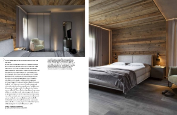 di pareti , le travi sbiancate che sottolineano la falda del tetto nella zona notte . La scelta di un arredo particolarmente chic e moderno caratterizza tutto il nuovo mood , distribuito su due piani comodamente serviti dall ’ ascensore . Ora è facile contemplare il salotto riquadrato dal tappeto vintage , l ’ accogliente divano , la delicatezza dei tavolini tondi che comunicano con naturale eleganza con la tecnologica cucina . A caratterizzarla , oltre le linee svettanti e pulite , ci sono i materiali innovativi ottenuti con l ’ impiego del Fenix e del gres porcellanato che presentano notevoli vantaggi . Il grande tavolo rettangolare , con abbinata corona di sedie , è sottolineato dalla sospensione anch ’ essa rettangolare in lamiera verniciata con illuminazione a led . Un piccolo “ volo ” in ascensore e si apre il mondo consacrato alla notte con le cromie che si fanno ancora più calde , i materiali sempre più avvolgenti e le luci più morbide che invitano al relax . Nelle due camere matrimoniali il legno diventa protagonista con la sua essenza vellutata ma in due diversi modi : nella camera padronale , attraverso un rivestimento ligneo che sale dal pavimento per diventare testata e poi soffitto rendendola simile a uno scrigno , mentre nella seconda camera è la falda del tetto con travi sbiancate a fare da nicchia rendendo tutto ancora più accogliente . La vasca da bagno accanto al letto , affacciata sulla vetrata , regala un tocco di ulteriore glamour e il piacere di godere di uno splendido panorama alpino .