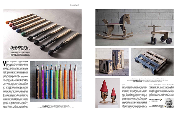 In alto : Rocking Horse e Olga , 2020 , marmo bianco di Carrara e inchiostri , 56x77x36 cm e 35x40x21 cm ; sopra da sinistra : Handle with care XS-S , 2019 , marmo bianco di Carrara e inchiostri , 43x31x37 cm e 77x31,5x39,5 cm ; Urban platform burned , 2021 , marmo bianco di Carrara e inchiostri , 80x60x15 cm . naria … “ Pallet bruciacchiati e casse da trasporto in disuso , relitti contemporanei propri di una quotidianità familiare , sinonimo di desolazione , abbandono e spreco , anziché essere relegati in depositi e magazzini , occupano indebitamente spazi espositivi . Decontestualizzati rispetto ai luoghi a loro propri , tali oggetti di natura prettamente utilitaristica , servi muti dell ’ industria come dell ’ arte , vengono offerti allo spettatore come opera , dove il contenitore inaspettatamente si propone come contenuto . Ogni mia opera è come se fosse scandita da una successione incalzante , a più riprese e più livelli , di ossimori visivi e tangibili . Concetti opposti e contrari vengono accostati in un unico oggetto generando così impreviste forme di paradosso : il legno diventa freddo , il marmo brucia e si carbonizza , la cassa da trasporto non contiene nulla ma risulta essere l ’ opera d ’ arte stessa . Ogni scultura , che concepisco come rappresentazione concreta della figura retorica dell ’ ossimoro , contraddice un termine con il suo opposto . In questo modo va contro le regole e il buon senso comune generando così un cortocircuito di significato , un senso di sorpresa e spiazzamento ” conclude Valeria Vaccaro .