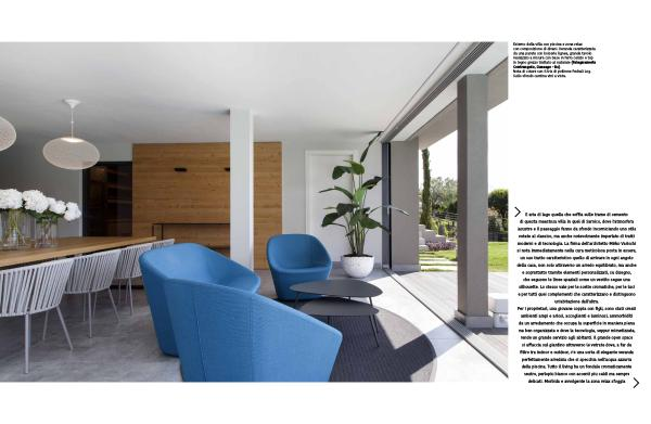 È aria di lago quella che soffia sulle trame di cemento di questa maestosa villa in quel di Sarnico , dove l ’ atmosfera lacustre e il paesaggio fanno da sfondo incorniciando uno stile votato al classico , ma anche notevolmente imperlato di tratti moderni e di tecnologia . La firma dell ’ architetto Mirko Varischi si nota immediatamente nella cura meticolosa posta in essere , un suo tratto caratteristico quello di arrivare in ogni angolo della casa , non solo attraverso un arredo equilibrato , ma anche e soprattutto tramite elementi personalizzati , su disegno , che seguono le linee spaziali come un vestito segue una silhouette . Lo stesso vale per le scelte cromatiche , per le luci e per tutti quei complementi che caratterizzano e distinguono un ’ abitazione dall ’ altra . Per i proprietari , una giovane coppia con figli , sono stati creati ambienti ampi e ariosi , accoglienti e luminosi , ammorbiditi da un arredamento che occupa la superficie in maniera piena ma ben organizzata e dove la tecnologia , seppur mimetizzata , rende un grande servizio agli abitanti . Il grande open space si affaccia sul giardino attraverso le vetrate dove , a far da filtro tra indoor e outdoor , c ’ è una sorta di elegante veranda perfettamente arredata che si specchia nell ’ acqua azzurra della piscina . Tutto il living ha un fondale cromaticamente neutro , perlopiù bianco con accenti più caldi ma sempre delicati . Morbida e avvolgente la zona relax sfoggia