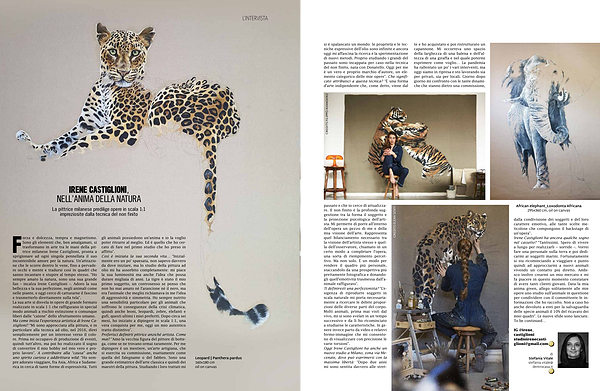 IG @ irene _ castiglioni studioirenecastiglioni @ gmail . com passato e che io cerco di attualizzare . Il non finito è la profonda suggestione tra la forma il soggetto e la proiezione psicologica dell ’ artista . Mi permette di porre all ’ interno dell ’ opera un pezzo di me e della mia visione dell ’ arte . Rappresenta quel bilanciamento necessario tra la visione dell ’ artista stesso e quella dell ’ osservatore , chiamato in un certo modo a completare l ’ opera , una sorta di riempimento percettivo . Ma non solo . È un modo per rendere il quadro più personale , staccandolo da una prospettiva più prettamente fotografica e donandogli quell ’ emotività trasmessa dall ’ a- nimale raffigurato ”. Ti definiresti una perfezionista ? “ L ’ e- sigenza di riprodurre soggetti in scala naturale mi porta necessariamente a ricercare le debite proporzioni delle diverse parti del corpo . Molti animali , prima mai visti dal vivo , mi si sono svelati in un tempo successivo e da lì ho ricominciato a studiarne le caratteristiche . In genere invece parto da video e relativi fermo-immagine che mi consentono di visualizzare con precisione le varie torsioni ”. Oggi Irene Castiglioni ha anche un nuovo studio a Milano , zona via Mecenate , dove può esprimersi con la massima libertà : “ Dopo due anni mi sono sentita davvero alle stretdi Stefania Vitale stefania . vitale @ dentrocasa . it
