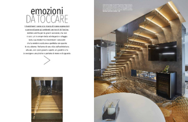 L ’ open space sfoggia una pavimentazione in parquet di Rovere , verniciato spazzolato naturale – scelta rustica – della collezione Loft , con angolazione di taglio a 30 °: la raffinata geometria di posa a spina ungherese mette in luce le meravigliose venature naturali del legno e crea uno scenografico effetto di movimento ( Emmepi Ceramiche , Rudiano - Bs ).