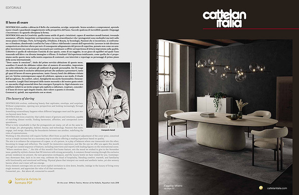 DENTROCASA cambia e abbraccia il Bello che contamina, avvolge, sorprende. Senza scendere a compromessi, aprendo nuove visuali e guardando maggiormente nella prospettiva del lusso. Succede qualcosa di incredibile quando i linguaggi s’ incontrano e lo sguardo oltrepassa la forma. DENTROCASA ama la Creatività, quella trama sottile di gesti e intuizioni. capace di matchare mondi lontani, trovando assonanze, affinità, inaspettate corrispondenze. La cosa straordinaria è che i protagonisti sono molteplici ma tutti sullo stesso piano: il Design, l’ Arte, la Fotografia, il Fashion, il Beauty, la Tecnologia. Passioni che si incontrano, si confrontano e si fondono, dissolvendo i confini fra l’ una e l’ altra e ridefinendo i canoni dell’ espressività. Lavorare in tale direzione comporterà un ulteriore sforzo per noi e il conseguente adeguamento del prezzo di copertina, pensato non come un semplice incremento ma come un passo necessario per continuare a offrire un’ esperienza di lettura improntata sulla qualità. L’ obiettivo è quello di valorizzare l’ unicità di uno spazio, come di un soggetto, in un gioco di equilibri nel quale l’ uno trascende nell’ altro e ne diventa immagine e riflesso. Il risultato? Un’ esperienza totalizzante, come quella che vi proponiamo anche questo mese nella nostra sequenza di contenuti, con interviste e reportage su personaggi di primo piano della scena internazionale.“ Dove osano le emozioni”, titolo del primo servizio abitazione di questo mese, scandisce il mood che abbiamo voluto dare al numero di novembre, improntato su scelte stilistiche che caricano gli ambienti di grande personalità. Un fil rouge che interessa tanto le esclusive abitazioni private che andiamo a presentarvi, tanto gli spazi di lavoro di nuova generazione, tanto i luxury hotel che abbiamo visitato per voi. Vetrine contemporanee capaci di celebrare, ognuna a suo modo, il rituale dell’ accoglienza, fra confort, calore, famigliarità ma anche funzionalità e benessere emotivo. Luoghi fisici interpreti delle nostre necessità e del nostro gusto estetico, ma anche rifugi sensoriali dove fare emergere il proprio io. Ogni elemento va a confluire infatti in un invito sempre più esplicito a rallentare, respirare, concedersi il lusso di vivere ogni singolo istante, dare valore a quanto ci circonda. Connessi sì, quindi, ma soprattutto con se stessi.