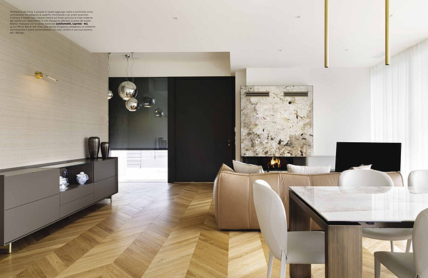 Panoramica del living: il parquet in rovere aggiunge calore e continuità visiva, contrastando con eleganza le superfici minimaliste e gli arredi essenziali. A sinistra il mobile mod. Cabaret mentre sul fondo spiccano le linee moderne del camino con rivestimento in Grès Patagonia abbinato al piano del tavolo Atlantis realizzato con lo stesso materiale( ostiliomobili, Capriolo- Bs). Le luci Mirror Ball di Tom Dixon alla vetrata d’ ingresso completano un ambiente che interpreta il vivere contemporaneo con stile, comfort e una cura estrema per i dettagli.