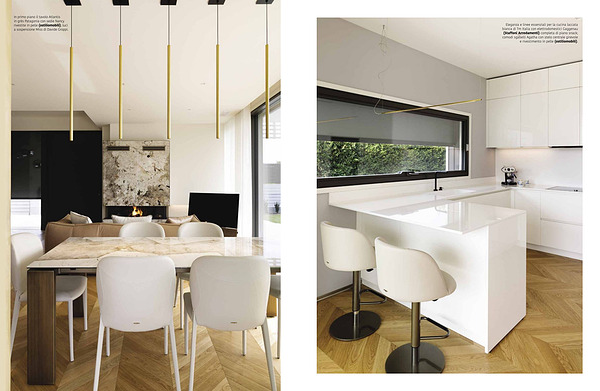 In primo piano il tavolo Atlantis in grès Patagonia con sedie Nancy rivestite in pelle( ostiliomobili); luci a sospensione Miss di Davide Groppi.