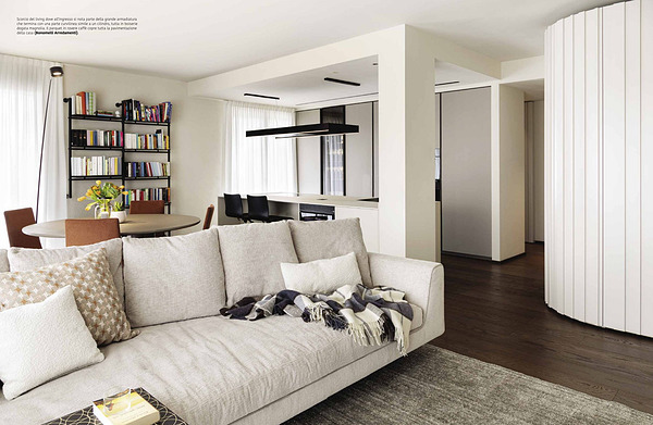 Scorcio del living dove all’ ingresso si nota parte della grande armadiatura che termina con una parte curvilinea simile a un cilindro, tutta in boiserie dogata magnolia. Il parquet in rovere caffè copre tutta la pavimentazione della casa( Bonomelli Arredamenti).