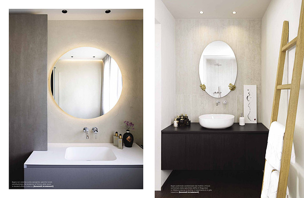 Bagno con colonna e anta sporgente; specchio tondo retroilluminato che evidenzia la finitura delle pareti in Kerakoll effetto materico( Bonomelli Arredamenti).