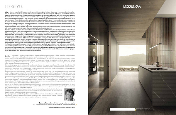 Once again, it is the light that powerfully and precisely sculpts the volumes of a home. This home. It becomes a hearth, a nest, a shelter; the mirror of the emotions of those who live within it. Located on the outskirts of Bergamo, it breathes the city’ s atmosphere but at the same time enjoys the pleasant quiet that soothes the soul every time you cross the threshold... Because the colours are relaxing, the materials warm, the fabrics soft, and the objects reassuring. The shapes, however, are a play of profiles, sometimes angular, sometimes curved; imaginary interlocks that create balanced and harmonious sequences. The interior design project is by Bonomelli Arredamenti, which in these spaces has enhanced the concept of modernity with designer furnishings, while maintaining the strong sense of warmth and hospitality that pervades the entire living experience. The entrance welcomes us with a magnolia wall with grooved panelling that extends into a cylindrical shape, concealing a complete wardrobe … Practical, versatile, and highly theatrical. After that, the open-plan living area unfolds: the lounge, kitchen, and dining area – the three main spaces – are united by a modern and pleasing style, suitable for conviviality, functionality, and relaxation. The lounge, facing the large light source that opens onto a terrace of approximately 80 square metres, is furnished with a sofa featuring soft lines and a curved backrest, which pleasantly contrasts with the TV unit’ s sharp edges, softened by a dramatic wooden sculpture handcrafted by a renowned artist. The oak parquet flooring, consistent throughout the house, including the bathrooms, provides the backdrop to the bespoke kitchen with an island and a snack bar designed with modern, minimal lines, focused on practicality, technology, and functionality. The roundness of the designer dining table with a spatulated clay top contrasts beautifully; a little gem, paired with rust-coloured chairs, the only splash of colour that energises the living space. Moving on, the sleeping area evokes the same emotions: harmony, proportion, serenity; an imaginary embrace where the furnishing choices create the ideal conditions to feel at ease. The bed, lit from below, appears to float in space, losing its conventional role to become something magical and dreamlike. The bathrooms reflect the same balance but with greater simplicity; elegance sheds all artifice, leaving the strength of materials to define the space: travertine clads the master bathroom, while the main bathroom features textured walls, both original in their composition. The lighting system, carefully designed and customised for each room, creates dedicated and adaptable atmospheres, according to need, perfecting the house’ s style with plays of light and shadow. A bespoke solution satisfying the homeowner on every occasion and at every moment.