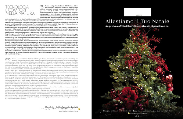 Mo. he, a boutique hotel in the heart of the Livigno Plateau, transforms the natural beauty of its surroundings into a unique hospitality experience: every space tells the story of the local area through the use of native materials – wood, stone, and design elements inspired by the surrounding forest – alongside installations designed to amaze. One of the most striking features is a 17-metre waterfall that flows from the private lake of the penthouse suite down to the ground floor, powering the blades of an old mill. That mill is still in operation today, grinding the flour used to make the hotel’ s fresh pasta. The offering is completed by a wine cellar with a curated selection of labels and a gourmet restaurant that houses a beautifully restored, ancient mountain hut, reconstructed inside the hotel. Run by a family with a deep-rooted passion for hospitality, the property sought a technology solution that could simplify daily management while enhancing the guest experience. The answer came in the form of Hi4-Supervisor ®, the automation system by Microdevice chosen for its combination of security, customisation, and user-friendliness. With Hi4-Supervisor ®, access control is centralised and fully customisable: guest rooms, shared areas, and staff-only spaces – from the garage to the ski room, wine cellar, and gym – are all managed automatically according to settings defined by the owners, which can be adjusted at any time. A badge reader in the lift recognises each user, enabling safe and seamless movement throughout the hotel with a single keycard. Management can also be carried out remotely via a web-based software platform, accessible from the owners’ devices: real-time access monitoring, selective user and area permissions, temperature control, and overall system supervision are all available at a glance. In case of anomalies or alarms, the system sends customised notifications via instant messaging and email, allowing for swift, targeted intervention. Hi4-Supervisor ® also intelligently manages indoor comfort: silicon sensors monitor real-time conditions and automatically adjust temperatures to ensure guest well-being while optimising energy consumption. To guarantee seamless integration and operational continuity, Hi4-Supervisor ® interfaces directly with the hotel’ s PMS( Property Management System), streamlining bookings, access control, and service management. Manual controls are still available: Mo. he has chosen Your Light panels with a Glass Black finish, custom-engraved icons, and elegant blue backlighting to ensure ease of use, even in the dark. The result is a hospitality concept that harmoniously blends local craftsmanship with discreet technology: a sensory and functional experience, designed to delight guests and simplify staff operations, all without losing the connection to Livigno’ s landscape and traditions.