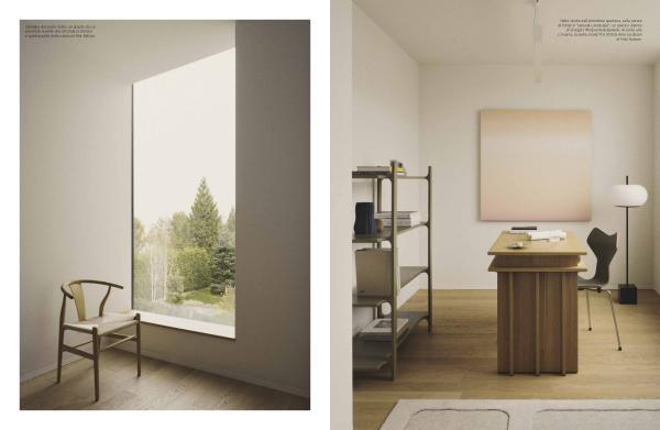 Nello studio dall’ atmosfera spartana, sulla parete di fondo è“ Sensual Landscape”, un poetico dipinto di Grzegorz Worpus-Budziejewski. Accanto alla scrivania, la sedia Grand Prix 3130 di Arne Jacobsen di Fritz Hansen.