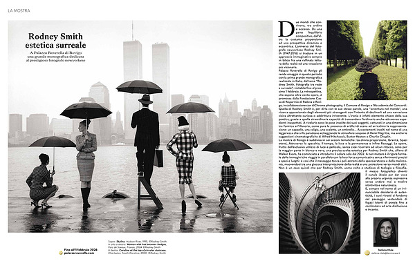 ue mondi che convivono, tra ordine e eccesso. Da una parte l’ equilibrio compositivo, dall’ altra la costante propensione ad una prospettiva dinamica e eccentrica. L’ universo del fotografo newyorkese Rodney Smith( 1947-2016) si traduce in un approccio immaginativo sempre in bilico fra una raffinata lettura della realtà ed una vocazione più visionaria. Palazzo Roverella di Rovigo gli rende omaggio in questo periodo con la prima grande monografica realizzata in Italia, dal tema“ Rodney Smith. Fotografia tra reale e surreale”, visitabile fino al prossimo 1 febbraio. La retrospettiva, che espone oltre cento opere, è promossa dalla Fondazione Cassa di Risparmio di Padova e Rovigo, in collaborazione con diChroma photography, il Comune di Rovigo e l’ Accademia dei Concordi. Quella di Rodney Smith è, per dirla con le sue stesse parole, una“ avventura nel mondo”, una ricerca appassionata degli elementi più stravaganti con l’ intento di declinarli ad una narrazione visiva altrettanto curiosa o addirittura irriverente. L’ ironia è infatti elemento chiave della sua poetica, grazie a quella straordinaria capacità di trascendere l’ ordinario anche attraverso espedienti inaspettati. A rivelarlo sono le pose insolite dei suoi soggetti, catturati in una dimensione tra l’ onirico e l’ illusorio, come pure la presenza di artifici di scena ad arricchire la rappresentazione: un cappello, una valigia, una scaletta, un ombrello... Accostamenti inediti nel nome di una leggerezza che si fa paradosso echeggiando le atmosfere sospese di René Magritte, ma anche le suggestioni cinematografiche di Alfred Hitchcock, Buster Keaton o Charlie Chaplin. La mostra di Rovigo è suddivisa in sei sezioni tematiche: La divina proporzione, Gravità, Spazi eterei, Attraverso lo specchio, Il tempo, la luce e la permanenza e infine Passaggi. Le opere, frutto dell’ esclusivo utilizzo di luce e pellicola, senza cioè ricorrere ad alcun ritocco, sono per la maggior parte in bianco e nero, una precisa scelta estetica per Rodney Smith che, allievo di Walker Evans, ha cominciato a introdurre il colore solo dal 2002. A non mutare è il rigore formale delle immagini che viaggia in parallelo con la loro forza comunicativa senza riferimenti precisi a spazi e luoghi: è così che il messaggio tocca i poli estremi della spensieratezza e della malinconia, muovendosi tra una giocosa interpretazione della realtà e una proiezione verso mondi altri. Non è un caso quindi che per Rodney Smith, uomo colto e studioso di teologia e filosofia, il mezzo fotografico diventi il canale ideale per dar voce alla propria urgenza espressiva senza andare mai a tradire istintività e naturalezza. E, sempre nel nome di un irrinunciabile desiderio di autenticità, i suoi ritratti si fondono nel paesaggio vestendolo di fugaci istanti di poesia fino a confondere ad arte disillusione e incanto.