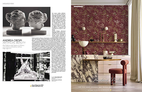 Un nuovo codice dell’ estetica, tra memoria classica e linguaggi tecnologici. La Fabbrica del Vapore di Milano ospita“ Artificial Beauty”, la prima grande mostra istituzionale sull’ opera di Andrea Crespi, curata da Alisia Viola e Sandie Zanini. Un viaggio immersivo tra pittura, scultura, installazioni e opere digitali, dove il concetto di bellezza si ridefinisce nel confronto tra umano e artificiale. Andrea Crespi, attraverso linguaggi ibridi e visioni stratificate, sta riscrivendo il rapporto tra arte, tecnologia e società. Veneri classiche vs corpi sintetici, umano vs artificiale, passato vs futuro, emozionale vs computazionale: tra opere iconiche e site-specific, l’ utilizzo di medium e tecnologie differenti,“ Artificial Beauty” è un’ indagine profonda e trasversale che attraversa i linguaggi visivi contemporanei e ne restituisce un corpo nuovo, sensibile, in costante oscillazione tra memoria e futuro. Il punto di partenza è il concetto di bellezza, osservato oggi nella sua trasformazione più radicale: non più armonia delle forme, ma territorio di sperimentazione e campo di tensione continua tra fisico e digitale, umano e macchina, emozione e algoritmo. Tra le opere in mostra“ Head of Aphrodite”, che reinterpreta la Venere di Milo unendo la scultura tradizionale a tecniche contemporanee, e“ Amore & Psiche / Artificial & Physical”, in cui l’ abbraccio eterno tra sentimento umano e costruzione artificiale diventa emblema di una nuova classicità. L’ opera è inserita in un ambiente specchiante che riflette e moltiplica le immagini: un gioco di riflessi e prospettive che invita a interrogarsi sulla relazione tra corpo, immagine e tecnologia. Di particolare interesse anche” The Artist”, un’ opera simbolica e fortemente evocativa che introduce i temi centrali dell’ intero progetto espositivo. Il titolo, volutamente ambiguo, innesca un cortocircuito semantico alla scoperta del ruolo dell’ artista nella contemporaneità.