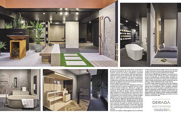 privato, tanto il professionista del settore, in particolare gli studi di architettura. Da un lato, quindi, un invito a scoprire, toccare con mano e immaginare, visionando in prima persona i pezzi ospitati nella vasta esposizione, dall’ altro la presenza di materioteche utili alla realizzazione di creativi moodboard. Un percorso poliedrico, dunque, che sa giocare con l’ emozione, orchestrando un’ esperienza sensoriale e ispirazionale al tempo stesso: spazi più accoglienti e tante nuove proposte che danno forma ai sogni di chi ama la casa. Il rinnovamento dello showroom Derada ha puntato su ambienti luminosi e percorsi espositivi dai toni neutri e monocromatici studiati per valorizzare i singoli materiali, ma anche proporre lavorazioni e ambientazioni complete, nel segno di design, qualità e innovazione. Ogni collezione è stata pensata per raccontare stili e tendenze del vivere contemporaneo: finiture che vestono le superfici e ne curano la cornice, creando il miglior biglietto da visita per ambienti da abitare e da amare. A tutto questo si aggiunge naturalmente l’ esperienza e la professionalità del team Derada guidato da Natalia Derada ed Emiliano Fermi, un’ autentica garanzia per chi cerca materiali di qualità e soluzioni innovative, oltre che consulenze tecniche ad hoc. Il claim del resto dice tutto:“ Innovativi per tradizione”. Un must per Derada che, anziché inseguire le tendenze, le precorre per vocazione. Il servizio è completo: dalla progettazione con sofisticati rendering 3d alla selezione degli articoli, fino alla posa in opera realizzata con personale specializzato, per concludere con una accurata assistenza post vendita. Sì perché per Derada ogni progetto è una storia da costruire step by step, insieme al proprio interlocutore, privato o professionista, nell’ ottica della completa customizzazione. Un processo creativo che unisce funzionalità e impatto estetico per superfici totalmente personalizzate, riflesso dell’ identità stessa del cliente. La scelta risulta amplissima grazie anche alla collaborazione con i brand più prestigiosi del settore: materiali naturali, gres porcellanato, marmo, parquet, moquette, laminati e pvc, carte da parati e superfici 3d. E, ad integrare la proposta, arredi di design, complementi e sanitari, prodotti selezionati e sempre di prima scelta per ambienti fascinosi, eleganti e intimi, studiati nel dettaglio. Ridefinire la bellezza. Per Derada, una mission, una vocazione, una firma di stile.