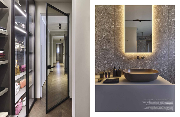 Secondo bagno della casa rivestito in ceramica Ceppo di Grè con specchio rettangolare retroilluminato, dove appare uno scorcio della doccia. Raffinato il mobile opaco su cui posa un lavabo dal design contemporaneo e dalle linee definite( ostiliomobili). A sinistra: la cabina armadio è stata realizzata con l’ intento di massimizzare gli spazi e renderla capiente. Interessante l’ utilizzo di materiali opachi abbinati al vetro che la rendono sofisticata. In particolare, la porta in vetro fumé crea un effetto vedo non vedo davvero singolare( ostiliomobili).