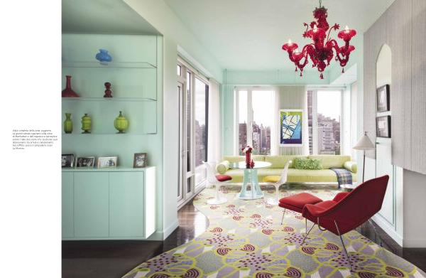 Vista completa della zona soggiorno. Le grandi vetrate spaziano sulla vista di Manhattan e dall’ ingresso si percepisce subito l’ idea del colore e lo studio dei suoi abbinamenti tra arredi e complementi. Sul soffitto spicca il lampadario rosso La Murrina.