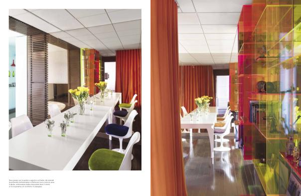 Zona pranzo con la parete a specchio sul fondo che estende la profondità dell’ ambiente e riflette più luce a tutta la zona. A destra: controcampo della zona pranzo dove il colore si fa trasparente con la libreria in plexiglass.