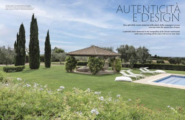 Il casale è immerso in un ampio giardino di otto ettari, che alterna prato e ulivi. Ospita una piscina rettangolare di dieci metri, circondata da pavimentazione in pietra naturale. Il patio adiacente è arredato con mobili firmati Atmosphera.
