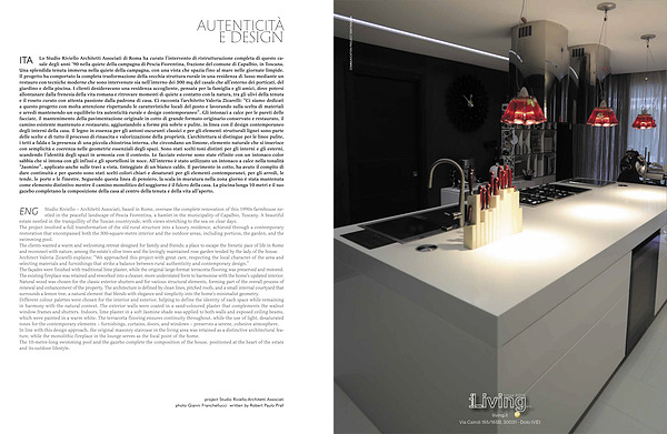 Studio Riviello – Architetti Associati, based in Rome, oversaw the complete renovation of this 1990s farmhouse nestled in the peaceful landscape of Pescia Fiorentina, a hamlet in the municipality of Capalbio, Tuscany. A beautiful estate nestled in the tranquillity of the Tuscan countryside, with views stretching to the sea on clear days. The project involved a full transformation of the old rural structure into a luxury residence, achieved through a contemporary restoration that encompassed both the 300-square-metre interior and the outdoor areas, including porticos, the garden, and the swimming pool. The clients wanted a warm and welcoming retreat designed for family and friends; a place to escape the frenetic pace of life in Rome and reconnect with nature, among the estate’ s olive trees and the lovingly maintained rose garden tended by the lady of the house. Architect Valeria Zicarelli explains:“ We approached this project with great care, respecting the local character of the area and selecting materials and furnishings that strike a balance between rural authenticity and contemporary design.” The façades were finished with traditional lime plaster, while the original large-format terracotta flooring was preserved and restored. The existing fireplace was retained and reworked into a cleaner, more understated form to harmonise with the home’ s updated interior. Natural wood was chosen for the classic exterior shutters and for various structural elements, forming part of the overall process of renewal and enhancement of the property. The architecture is defined by clean lines, pitched roofs, and a small internal courtyard that surrounds a lemon tree, a natural element that blends with elegance and simplicity into the home’ s minimalist geometry. Different colour palettes were chosen for the interior and exterior, helping to define the identity of each space while remaining in harmony with the natural context. The exterior walls were coated in a sand-coloured plaster that complements the walnut window frames and shutters. Indoors, lime plaster in a soft Jasmine shade was applied to both walls and exposed ceiling beams, which were painted in a warm white. The terracotta flooring ensures continuity throughout, while the use of light, desaturated tones for the contemporary elements – furnishings, curtains, doors, and windows – preserves a serene, cohesive atmosphere. In line with this design approach, the original masonry staircase in the living area was retained as a distinctive architectural feature, while the monolithic fireplace in the lounge serves as the focal point of the home. The 10-metre-long swimming pool and the gazebo complete the composition of the house, positioned at the heart of the estate and its outdoor lifestyle. project Studio Riviello-Architetti Associati photo Gianni Franchellucci written by Robert Paulo Prall