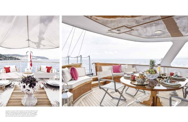 La poppa è una vera e propria terrazza sul mare dove poltrone e pouf Ethimo si confrontano con un raffinato servizio da tavola“ Il viaggio di Nettuno” di Luke Edward Hall per Richard Ginori, accompagnato da calici Amaranta e Damasco con poltrone e pouf Costes di Ethimo per la zona relax, tavolo in teak e poltroncine Studios di Ethimo.