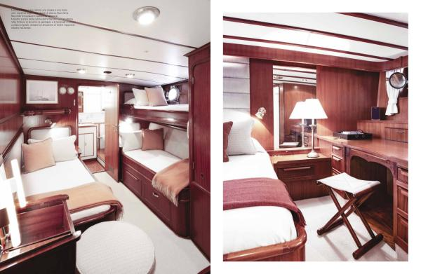 A prua si trovano due cabine, una doppia e una tripla con i rispettivi bagni, tutti dotati di doccia. Biancheria The Linen Kit e plaid in cachemire Lanerossi. A destra: scorcio della cabina dell’ armatore; la ricercatezza nelle finiture, le boiserie, le appliques e le lampade in ottone lucidato originali, donano la sensazione di essere trasportati indietro nel tempo.