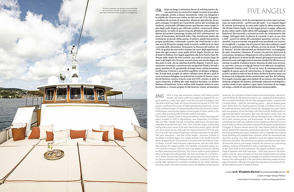 Sambonet, the soft glow of Andon lamps in borosilicate glass, and the luxurious fabrics by Jab Anstoetz create a cosy, sophisticated atmosphere. This contrasts beautifully with the fully equipped kitchen, complete with a central island – ideal for entertaining guests – and an elegant guest head. Below deck, the sleeping quarters include a full-beam owner’ s cabin with two private bathrooms located aft, alongside two guest cabins and crew quarters. All are furnished with The Linen Kit bedding and vintage-inspired leather accessories that echo the yacht’ s classic style. On the upper deck, the wheelhouse offers a 360-degree view, while the captain’ s cabin ensures privacy and functionality. At the bow, a generous sunbathing area with cosy cushions invites relaxation, while the sea-view terrace features Ethimo armchairs and pouffes alongside a sophisticated Il Viaggio di Nettuno dinner service by Luke Edward Hall for Richard Ginori, paired with Amaranta and Damasco glassware. The refit included painting, polishing and expert carpentry work to highlight the original wood panelling and polished brass elements, while the mechanical and electronic systems were fully updated to meet the highest standards of efficiency and safety. The neutral colour palette, enriched by warm tones of terracotta, brown, and orange, envelops the interiors in a welcoming embrace, evoking 1970s aesthetics with a contemporary flair. As the final touch to this restoration, the elegant starboard staircase – made of stainless steel with teak steps – offers easy access to the water, crafted with the same artisanal care that has characterised every phase of the refit. Today, Five Angels re-emerges as a symbol of restoration that honours the craftsmanship of the past while embracing modern technology and comfort, offering every guest the experience of a journey through time aboard a yacht of timeless beauty.