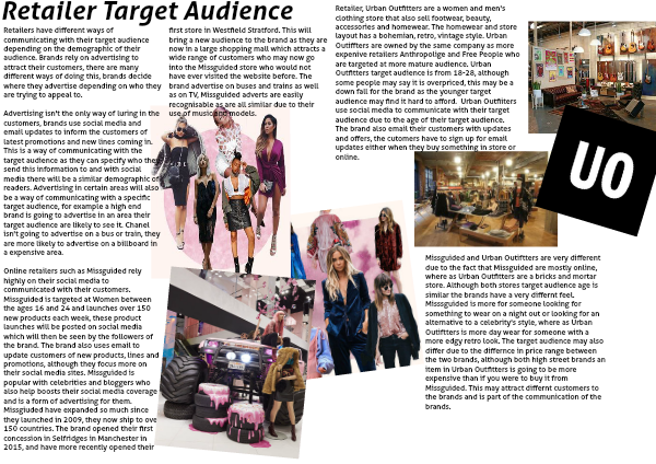 Retailer, Urban Outfitters are a women and men's clothing store that also sell footwear, beauty, accessories and homewear. The homewear and store layout has a bohemian, retro, vintage style. Urban Outiffters are owned by the same company as more expenive retailers Anthropolige and Free People who are targeted at more mature audience. Urban Outfitters target audience is from 18-28, although some people may say it is overpriced, this may be a down fall for the brand as the younger target audience may find it hard to afford. Urban Outfiiters use social media to communicate with their target audience due to the age of their target audience. The brand also email their customers with updates and offers, the cutomers have to sign up for email updates either when they buy something in store or online.