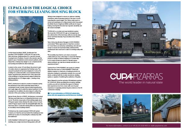 London-based architect , WHAT _ Architecture has specified CUPA PIZARRAS ’ CUPACLAD 101 Logic as the ideal rainscreen cladding system for a new and unusual housing block in Peckham . Crucial to this decision was the system ’ s ease of installation and its natural aesthetic , which helped the contemporary design to also complement the surrounding and traditional urban landscape .