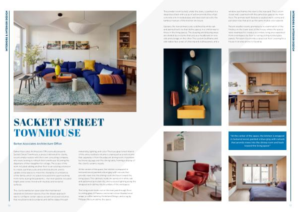 " At the center of the space , the kitchen is wrapped in textured wood , painted a blue-gray with cutouts that provide views into the dining room and back toward the living space ."