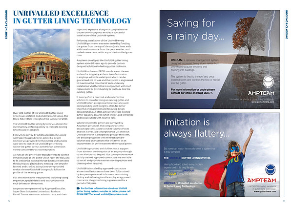 Over 400 metres of the Unifold ® Gutter lining system was installed on London ’ s iconic venue , The Royal Albert Hall , throughout the summer of 2023 .
