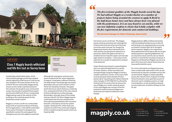 A potentially catastrophic blaze, which consumed the garage containing a parked vehicle adjoining a £ 1M house in rural Surrey, was stopped in its tracks thanks to the use of 12mm A1 non combustible Magply being chosen as the render substrate board on the contract, the property was constructed using a Structurally Insulated Panel system construction( SIP) with A1 non-combustible Magply being used on the exterior of the building as the substrate panel for the proprietary render system.